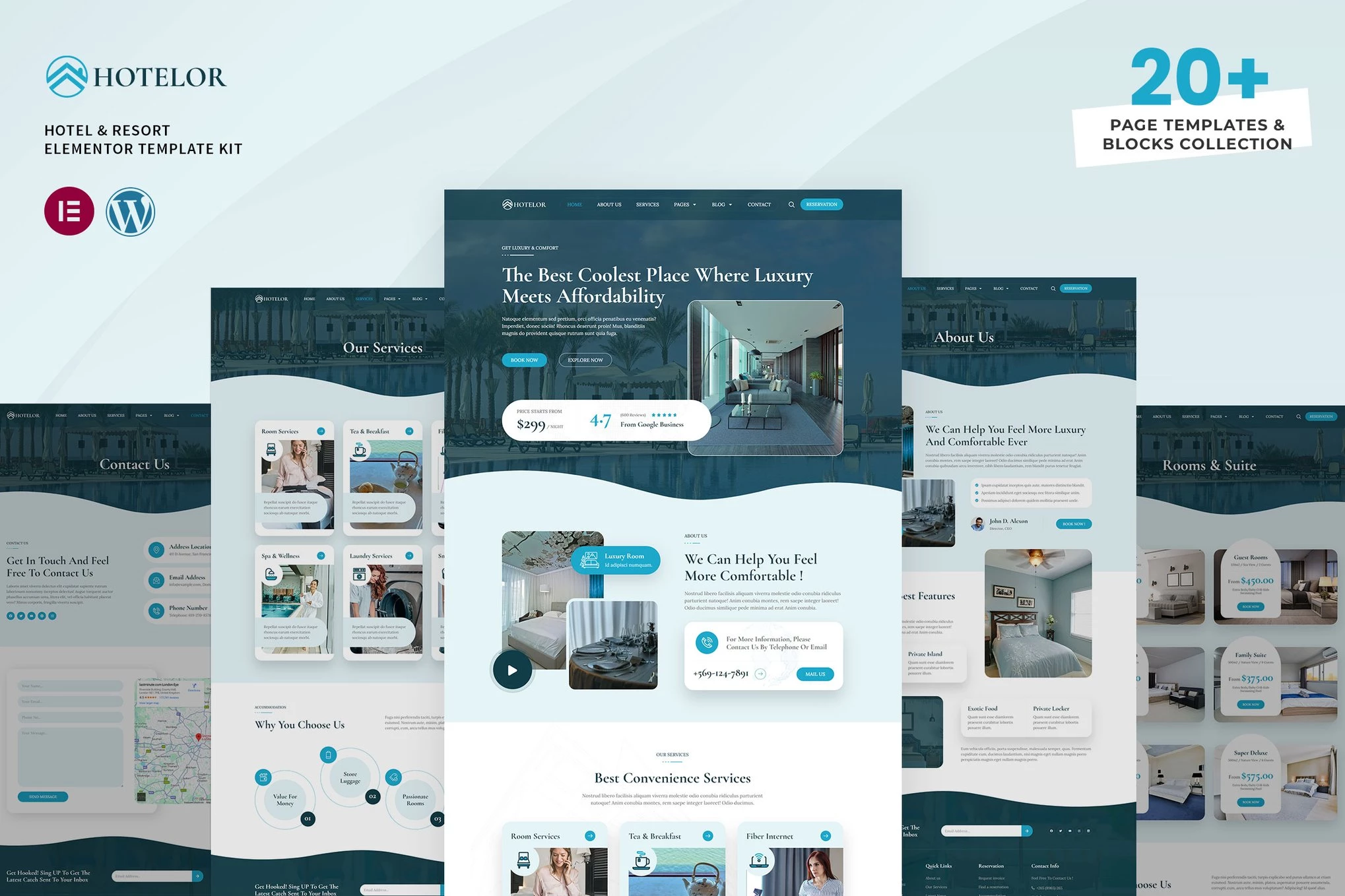 Hotelor: Kit de plantillas Elementor para hoteles y complejos turísticos creado especialmente para crear sitios versátiles, como hoteles, complejos turísticos, alojamientos, casas de huéspedes, hostales, bienes raíces, reservas, spa, apartamentos, turismo, viajes, villas, agencias y todos los demás sitios web de negocios hoteleros sin una sola línea de codificación.