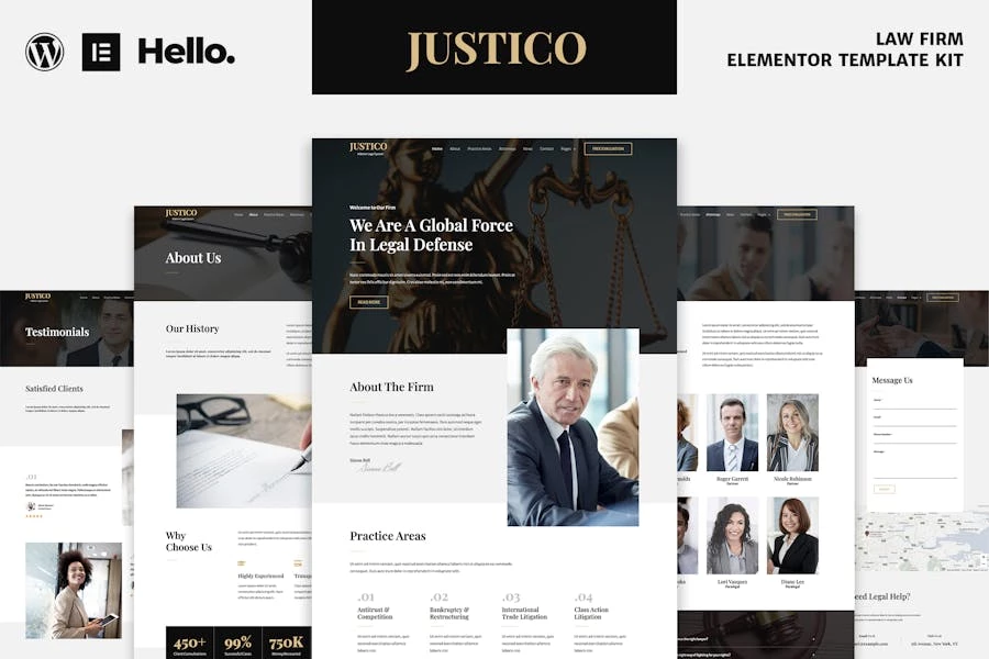 Especificaciones: JUSTICO – Template Kit Elementor para despachos de abogados