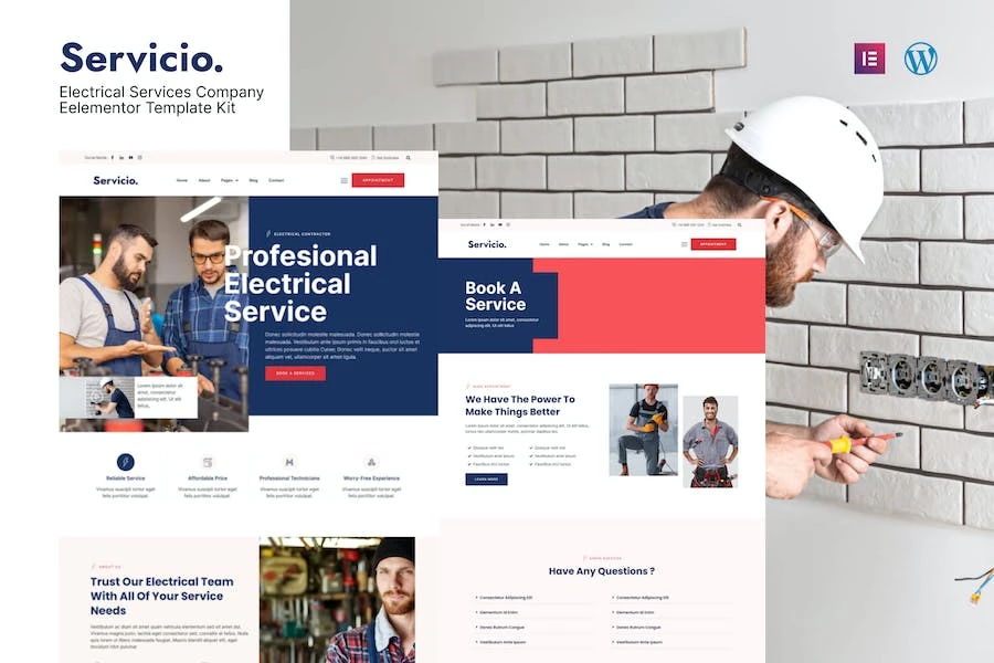 Servicio es un Template Kit de Electricistas y Servicios Eléctricos perfecto para una empresa de electricistas y servicios eléctricos, instalaciones eléctricas, personal de mantenimiento, servicios de aire acondicionado o cualquier servicio de mejoras y mantenimiento del hogar. Construido con un diseño contemporáneo y moderno y también fácil de personalizar.