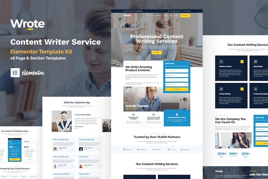 Wrote es un kit de plantillas de sitios web de Elementor diseñado y desarrollado específicamente para ayudarlo a crear un sitio web profesional o una página de destino para sus servicios de redacción, como redacción de contenido, redacción de contenido para SEO y administración de redes sociales. Cuando compres nuestro kit de plantillas Wrote Elementor, obtendrás 18 deslumbrantes plantillas predefinidas de páginas y secciones